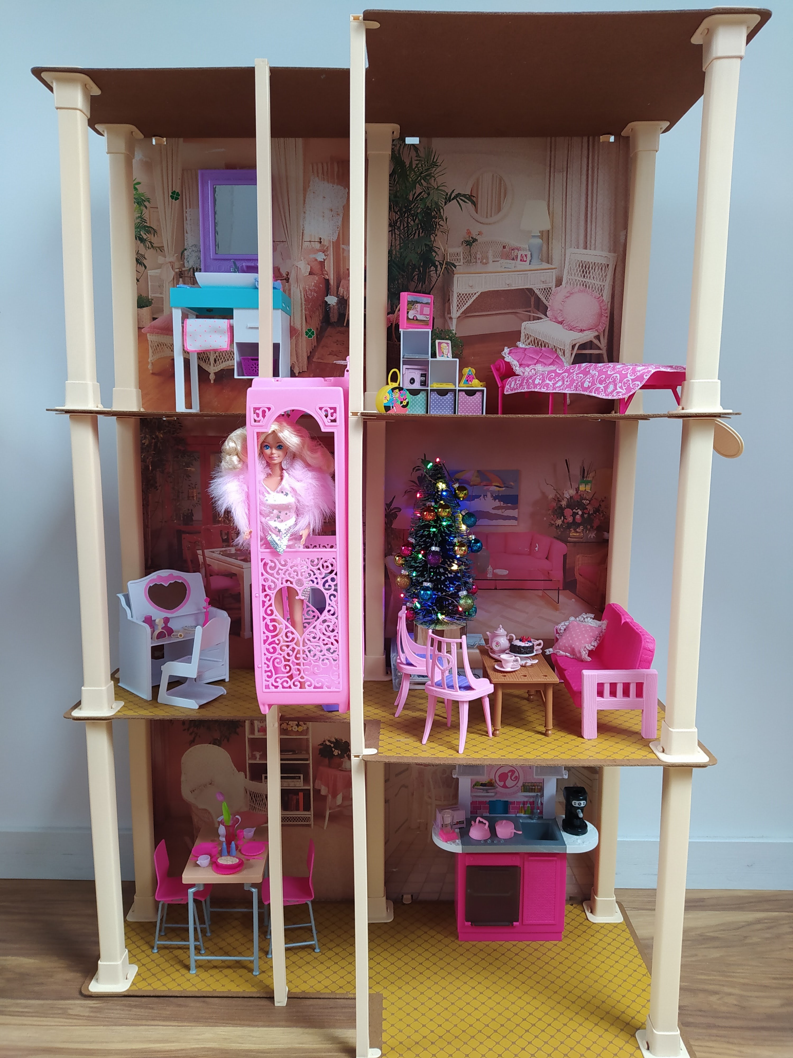 Jednak największą sensacją minionych 12 miesięcy jest Barbie Townhouse 1982! Składaniu tego domku towarzyszyły takie emocje, że aż trudno mi to opisać, lepiej byłoby użyć samych wykrzykników. Domek jest trzypiętrowy i ma windę (ja coś wspominałam, że domki miały być kompaktowe?). Jednak nie to jest w nim najwspanialsze, bo przecież mnóstwo jest domków z windą, co mają trzy piętra. Nie, ten Townhouse jest absolutnie wyjątkowy, ponieważ prawie identyczny miałam w dzieciństwie. Mój pochodził z roku 1986, miał nieco inną kolorystykę, a filary miały przekrój walca, ale chyba tego wariantu nie uda mi się zdobyć. Tak piszę, ale Barbie w tym roku niejednokrotnie mnie już zaskoczyła, więc wszystko jest możliwe. Domek umeblowałam kompletnie w zaledwie jeden miesiąc. Niestety obecnie jest złożony w kartonie, a przed zdemontowaniem nie udało mi się sfotografować aktualnego stanu umeblowania, wstawiam więc stare zdjęcia. Będą nowe, a domek złożę ponownie. Taki domek nie może leżeć w kartonie, prawda?